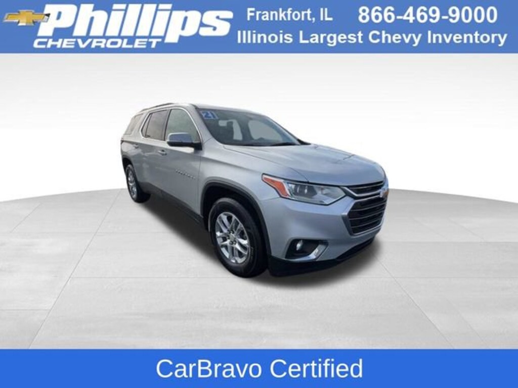CarBravo Certified, AWD, Trailering Package, Backup Camera, Remote Start, 7 Passenger Seating, Pwr Dr Seat, Side Blind Zone Alert, Rear Cross Traffic Alert, Lane Change Alert, Rear Park Assist, Heated Seats, Power Liftgate, Apple CarPlay, Aluminum Wheels, Carfax Buyback Guarantee, Traverse LT 1LT, 4D Sport Utility, 3.6L V6 SIDI VVT, 9-Speed Automatic, AWD, Silver Ice Metallic, Jet Black w/Premium Cloth Seat Trim, 3rd row seats: split-bench, 4-Wheel Disc Brakes, 6 Speakers, 7-Passenger Seating (2-2-3 Seating Configuration), ABS brakes, Air Conditioning, AM/FM radio: SiriusXM, Apple CarPlay/Android Auto, Automatic temperature control, Brake assist, Bumpers: body-color, Compass, Driver door bin, Driver vanity mirror, Dual front impact airbags, Dual front side impact airbags, Electronic Stability Control, Emergency communication system: OnStar and Chevrolet connected services capable, Four wheel independent suspension, Front anti-roll bar, Front Bucket Seats, Front Center Armrest, Front dual zone A/C, Front fog lights, Front reading lights, Fully automatic headlights, Garage door transmitter, Heated door mirrors, Heated front seats, Heavy-Duty Cooling System, High-Intensity Discharge Headlights, Hitch Guidance w/Hitch View, Illuminated entry, Leather steering wheel, Low tire pressure warning, Occupant sensing airbag, Outside temperature display, Overhead airbag, Overhead console, Passenger door bin, Passenger vanity mirror, Power door mirrors, Power driver seat, Power Liftgate, Preferred Equipment Group 1LT, Premium Cloth Seat Trim, Radio: Chevrolet Infotainment 3 Plus System, Rear air conditioning, Rear anti-roll bar, Rear reading lights, Rear window defroster, Rear window wiper, Remote keyless entry, Security system, SiriusXM w/360L, Speed control, Speed-sensing steering, Spoiler, Steering wheel mounted audio controls, Tachometer, Telescoping steering wheel, Tilt steering wheel, Traction control, Trailering Assist Guidelines, Trailering Equipment, Trip computer, Turn signal indicator mirrors, Variably intermittent wipers, Voltmeter, Wheels: 18 Bright Silver Painted Aluminum. 2021 Chevrolet Traverse Silver Ice Metallic LT 4D Sport Utility 1LT AWD 9-Speed Automatic 17/25 City/Highway MPG 3.6L V6 SIDI VVTAwards:* 2021 IIHS Top Safety Pick with optional front crash prevention and specific headlights Certification Program Details: Type your description hereWith the internet today, a great value shouldnât be hard to find. Here at Phillips Chevrolet we do the research for you. We monitor the market daily to ensure our customers are getting the best value achievable. We price all of our vehicles to make the buying process as simple and easy as possible. Our internet prices are just one factor that makes us the #1, #2, and out to be the #3 Chevrolet dealerships in Illinois. The #2 Chevy dealership in Illinois is conveniently located just a one block south of 80/94, at 17730 S Torrence Avenue in Lansing, IL 60438.