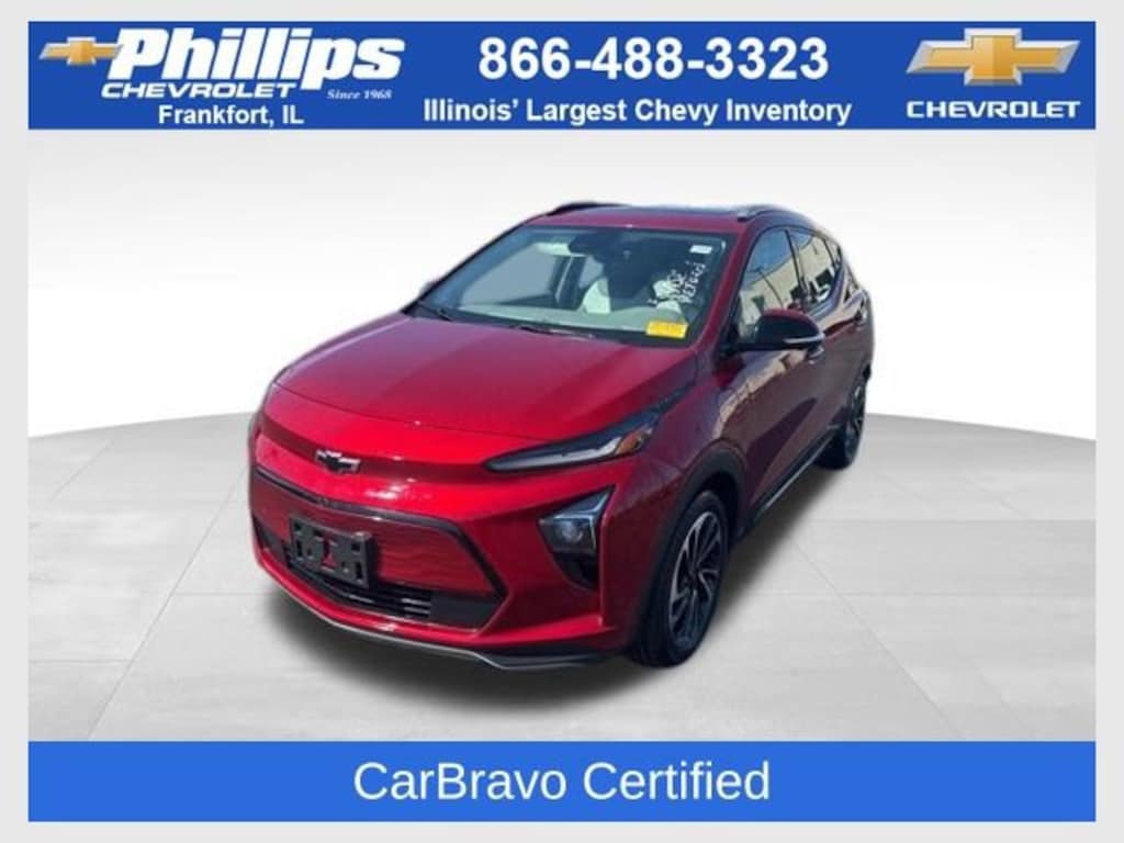 CarBravo Certified, Super Cruise, Leather Seats, Panoramic Roof, Backup Camera, Remote Start, Pwr Dr Seat, Navigation, Bose Audio, Side Blind Zone Alert, Rear Cross Traffic Alert, Lane Change Alert, Heated Seats, Heated Steering Wheel, Ventilated Seats, Apple CarPlay, Aluminum Wheels, No added Certification fees, Carfax Buyback Guarantee, Bolt EUV Premier, 4D Sport Utility, Electric Motor, 1-Speed Automatic, FWD, Radiant Red Tintcoat, Dark Ash Gray/Sky Cool Gray w/Perforated Leather-Appointed Seat Trim, 2-Way Power Driver Lumbar Seat Adjuster, 4-Wheel Disc Brakes, 6-Way Manual Passenger Seat Adjuster, 7.05 Final Drive Axle Ratio, 8-Way Power Driver Seat Adjuster, ABS brakes, Air Conditioning, AM/FM radio: SiriusXM with 360L, Apple CarPlay/Android Auto, Auto High-beam Headlights, Auto-dimming Rear-View mirror, Automatic temperature control, Bose Premium 7-Speaker Audio System, Brake assist, Bumpers: body-color, Compass, Electronic Stability Control, Enhanced Automatic Emergency Braking, Exterior Parking Camera Rear, Fully automatic headlights, Heated door mirrors, Heated Driver & Front Passenger Seats, Heated rear seats, Heated steering wheel, Illuminated entry, Navigation System, Outside temperature display, Overhead console, Passenger door bin, Perforated Leather-Appointed Seat Trim, Performance Ride & Handling Suspension, Power door mirrors, Power Dual Panel Panoramic Sunroof w/Slide, Preferred Equipment Group 2LZ, Radio: Chevrolet Infotainment 3 Plus System w/Navi, Rain sensing wipers, Rear reading lights, Rear seat center armrest, Rear window defroster, Rear window wiper, Remote keyless entry, Roof rack: rails only, Security system, SiriusXM Radio w/360L, Split folding rear seat, Steering wheel mounted audio controls, Sun & Sound Package, Super Cruise, Super Cruise Package, Telescoping steering wheel, Tilt steering wheel, Traction control, Trip computer, Turn signal indicator mirrors, Variably intermittent wipers, Ventilated Driver Seat, Ventilated Front Passenger Seat, Wheels: 17 Machined-Face Aluminum. 2023 Chevrolet Bolt EUV Radiant Red Tintcoat Premier 4D Sport Utility FWD 1-Speed Automatic 125/104 City/Highway MPG Electric Motor