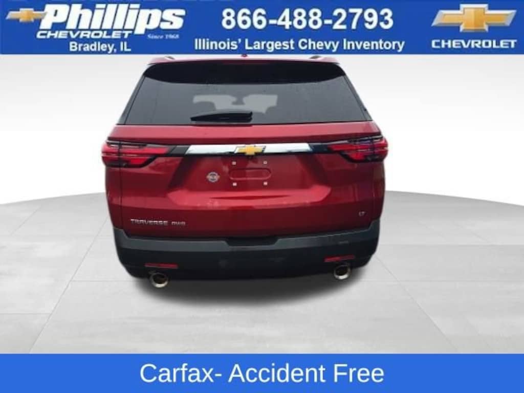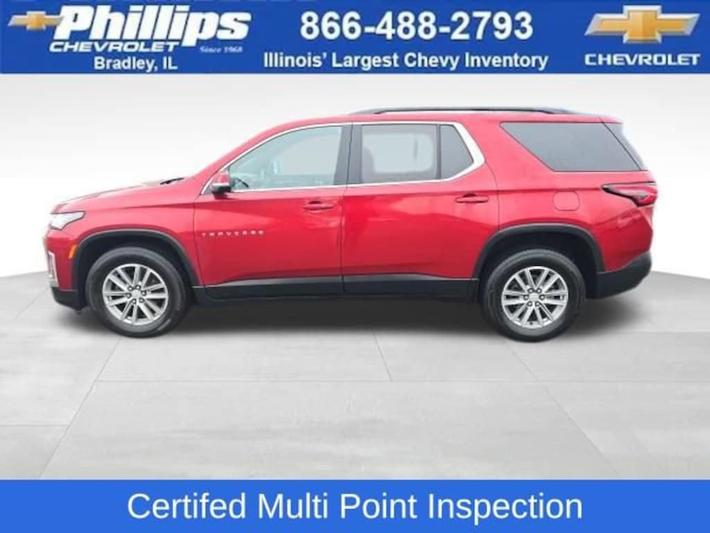 Carbravo Certified, Certifed Multi Point Inspection, One Owner, Carfax- Accident Free, Apple CarPlay, Keyless Entry, AWD, Back Up Camera, Blind Spot Monitoring, Bluetooth, Cruise Control, Heated seats, Heated steering wheel, Forward Collision Alert, Intellibeam, Power lift gate, Power Locks, Power Seating, Power Windows, Push Button Start, Remote start, Trailering Equipment, 18 Wheels, Carfax Buyback Guarantee, Traverse LT Leather, 4D Sport Utility, 3.6L V6 SIDI VVT, 9-Speed Automatic, AWD, Radiant Red Tintcoat, Black Leather, 3.49 Axle Ratio, 3rd row seats: split-bench, 4-Wheel Disc Brakes, 6-Speaker Audio System Feature, 6-Way Power Front Passenger Seat, 8-Way Power Driver Seat Adjuster, ABS brakes, AM/FM radio: SiriusXM with 360L, Apple CarPlay/Android Auto, Black Roof Rails, Brake assist, Bumpers: body-color, Compass, Driver door bin, Driver vanity mirror, Dual front impact airbags, Dual front side impact airbags, Electronic Stability Control, Emergency communication system, Exterior Parking Camera Rear, Four wheel independent suspension, Front anti-roll bar, Front Bucket Seats, Front Center Armrest, Front dual zone A/C, Front Passenger 2-Way Power Lumbar, Front reading lights, Fully automatic headlights, Garage door transmitter, Heated door mirrors, Heated Driver & Front Passenger Seats, Heated steering wheel, Heavy-Duty Cooling System, Hitch Guidance w/Hitch View, Illuminated entry, Leather steering wheel, Leather-Appointed Seat Trim, Low tire pressure warning, Occupant sensing airbag, Outside temperature display, Overhead airbag, Overhead console, Panic alarm, Passenger door bin, Passenger vanity mirror, Power door mirrors, Power Driver Lumbar Control, Power Liftgate, Power passenger seat, Power steering, Power windows, Preferred Equipment Group 3LT, Premium audio system: Chevrolet Infotainment 3 Plus, Rear air conditioning, Rear anti-roll bar, Rear reading lights, Rear window defroster, Rear window wiper, Remote keyless entry, Security system, Speed control, Speed-sensing steering, Spoiler, Steering wheel mounted audio controls, Tachometer, Telescoping steering wheel, Tilt steering wheel, Traction control, Trailering Assist Guidelines, Trailering Equipment, Trip computer, Turn signal indicator mirrors, Variably intermittent wipers, Voltmeter, Wheels: 18 Bright Silver-Painted Aluminum. CARFAX One-Owner. Clean CARFAX. Certified. Radiant Red Tintcoat 2023 Chevrolet Traverse LT Leather AWD 9-Speed Automatic 3.6L V6 SIDI VVTOdometer is 3637 miles below market average!Certification Program Details: Type your description hereWith the internet today, a great value shouldn't be hard to find. Here at Phillips Chevrolet we do the research for you. We monitor the market daily to ensure our customers are getting the best value achievable. We price all of our vehicles to make the buying process as simple and easy as possible. Our internet prices are just one factor that makes us the #1, #2, and out to be the #3 Chevrolet dealerships in Illinois. The future #3 Chevy dealership in Illinois is conveniently located at 1400 Locke Drive, the corner of I-57 & IL 50, in Bradley/Bourbonnais, IL 60914.