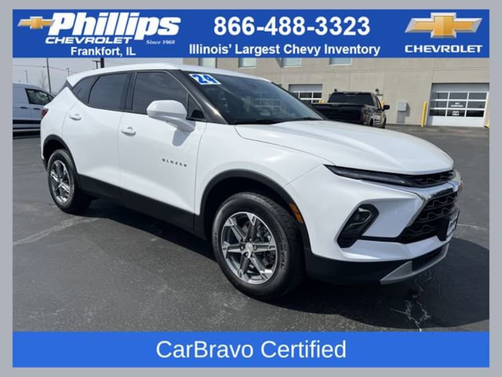 CarBravo Certified, Backup Camera, Remote Start, Pwr Dr Seat, Heated Seats, Apple CarPlay, Aluminum Wheels, Carfax Buyback Guarantee, Blazer LT, 4D Sport Utility, 2.0L Turbocharged, 9-Speed Automatic with Overdrive, FWD, Summit White, Jet Black/Medium Gray w/Premium Cloth Seat Trim, 170 Amp Alternator, 4-Way Manual Front Passenger Seat Adjuster, 4-Wheel Disc Brakes, 6-Speaker Audio System Feature, 8-Way Power Driver Seat Adjuster, ABS brakes, AM/FM radio: SiriusXM with 360L, Apple CarPlay/Android Auto, Auto High-beam Headlights, Automatic temperature control, Brake assist, Bumpers: body-color, Child-Seat-Sensing Airbag, Compass, Driver door bin, Driver vanity mirror, Electronic Stability Control, Four wheel independent suspension, Front Bucket Seats, Front Center Armrest, Front dual zone A/C, Front reading lights, Fully automatic headlights, Heated door mirrors, Heated Driver & Front Passenger Seats, Illuminated entry, Leather Shift Knob, Outside temperature display, Overhead console, Passenger door bin, Passenger vanity mirror, Power door mirrors, Power Driver Lumbar Control, Preferred Equipment Group 2LT, Premium audio system: Chevrolet Infotainment 3 Plus, Premium Cloth Seat Trim, Radio data system, Radio: Chevrolet Infotainment 3 Plus System, Rear reading lights, Rear seat center armrest, Rear window defroster, Rear window wiper, Remote keyless entry, Ride & Handling Suspension, Security system, SiriusXM w/360L, Speed control, Speed-sensing steering, Split folding rear seat, Spoiler, Steering wheel mounted audio controls, Tachometer, Telescoping steering wheel, Tilt steering wheel, Traction control, Trip computer, Variably intermittent wipers, Voltmeter, Wheels: 18 Grazen Metallic Aluminum. 2024 Chevrolet Blazer Summit White LT 4D Sport Utility FWD 9-Speed Automatic with Overdrive 22/29 City/Highway MPG 2.0L Turbocharged22/29 City/Highway MPG Recent Arrival!Certification Program Details: Type your description hereWith the internet today, a great value shouldnât be hard to find. Here at Phillips Chevrolet we do the research for you. We monitor the market daily to ensure our customers are getting the best value achievable. We price all of our vehicles to make the buying process as simple and easy as possible. Our internet prices are just one factor that makes us the #1, #2, and out to be the #3 Chevrolet dealerships in Illinois. The #2 Chevy dealership in Illinois is conveniently located just a one block south of 80/94, at 17730 S Torrence Avenue in Lansing, IL 60438.