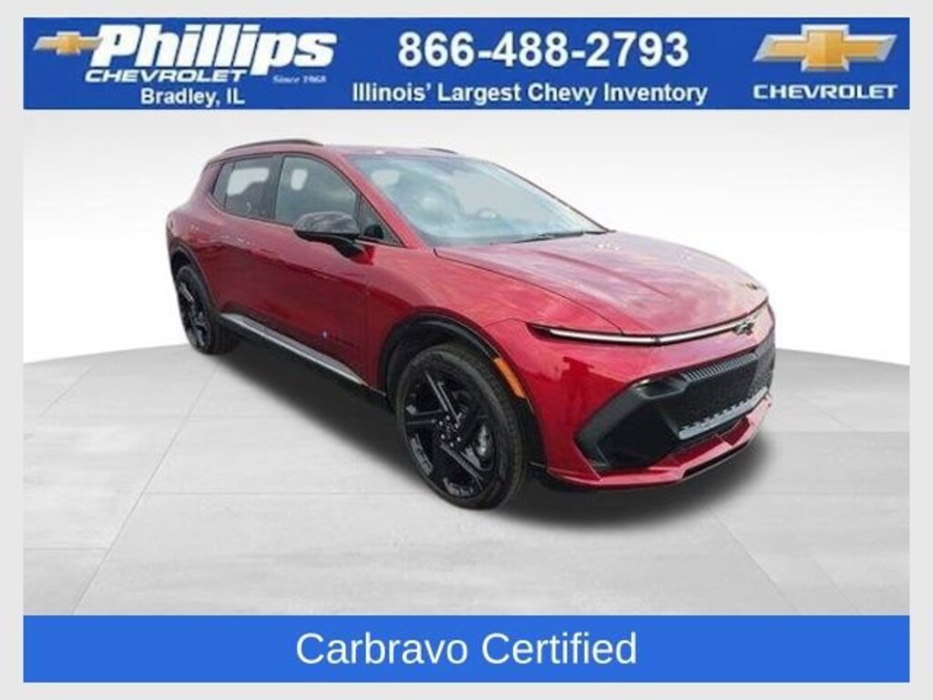 Carbravo Certified, One Owner, Apple CarPlay, Android Auto, Keyless Entry, Adaptive Cruise Control (ACC), Back Up Camera, Blind Spot Monitoring, Bluetooth, Heated seats, Heated steering wheel, Forward Collision Alert, Lane Assist, Pedestrian Monitoring, Power Locks, Power Seating, Power Windows, Push Button Start, Rear Traffic Alert, Remaining factory warranty, Remote start, Rear Park Assist, Carfax Buyback Guarantee, Equinox EV RS, 4D Sport Utility, Electric Drive Unit, 1-Speed Automatic, AWD, Radiant Red Tintcoat, Black With Red Accents Premium Synthetic, 4-Wheel Disc Brakes, 8-Way Power Driver Seat Adjuster, Auto High-beam Headlights, Auto-dimming Rear-View mirror, Brake assist, Compass, Delay-off headlights, Driver 4-Way Power Lumbar Control, Driver door bin, Driver vanity mirror, Dual front side impact airbags, Electronic Stability Control, Evotex Seat Trim, Four wheel independent suspension, Front anti-roll bar, Front Electric AWD, Front reading lights, Fully automatic headlights, Heated door mirrors, Heated Driver & Fr Passenger Seats Cushion & Seatback, Heated steering wheel, Illuminated entry, Knee airbag, Low tire pressure warning, Navigation system: Google built-in compatibility (select service plan required, terms and limitations apply), Occupant sensing airbag, Outside temperature display, Overhead airbag, Overhead console, Panic alarm, Passenger vanity mirror, Power door mirrors, Power Liftgate, Preferred Equipment Group 2RS, Rear anti-roll bar, Rear reading lights, Rear seat center armrest, Rear window wiper, Remote keyless entry, Security system, Speed control, Split folding rear seat, Spoiler, Sport steering wheel, Steering wheel mounted audio controls, TBD Axle Ratio, Traction control, Turn signal indicator mirrors, Variably intermittent wipers, Wheels: 21 Black Painted Aluminum. CARFAX One-Owner. Clean CARFAX. Certified. Radiant Red Tintcoat 2024 Chevrolet Equinox EV RS AWD 1-Speed Automatic Electric Drive UnitCertification Program Details: Type your description hereWith the internet today, a great value shouldn't be hard to find. Here at Phillips Chevrolet we do the research for you. We monitor the market daily to ensure our customers are getting the best value achievable. We price all of our vehicles to make the buying process as simple and easy as possible. Our internet prices are just one factor that makes us the #1, #2, and out to be the #3 Chevrolet dealerships in Illinois. The future #3 Chevy dealership in Illinois is conveniently located at 1400 Locke Drive, the corner of I-57 & IL 50, in Bradley/Bourbonnais, IL 60914.