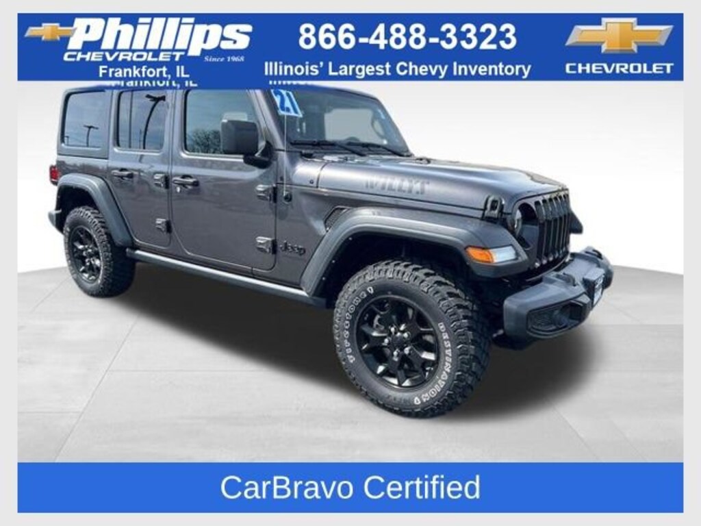 CarBravo Certified, 4WD, Body-Color 3-Piece Hard Top, Trailering Package, Backup Camera, Remote Start, Navigation, Heated Seats, Apple CarPlay, Aluminum Wheels, Carfax Buyback Guarantee, Wrangler Unlimited Willys, 4D Sport Utility, 3.6L V6 24V VVT, 8-Speed Automatic, 4WD, Granite Crystal Metallic Clearcoat, Black w/Cloth Low-Back Bucket Seats, 240 Amp Alternator, 4-Wheel Disc Brakes, 4-Wheel Drive Swing Gate Decal, 7 & 4 Pin Wiring Harness, 7.0 Touchscreen Display, 700 Amp Maintenance Free Battery, 8.4 Radio & Premium Audio Group, ABS brakes, Air Conditioning w/Auto Temperature Control, Air Filtering, Alpine Premium Audio System, Anti-Spin Differential Rear Axle, Apple CarPlay, Auto-Dimming Rear-View Mirror, Automatic Headlamps, Auxiliary Switches, Black 3-Piece Hard Top, Black Grille, Black Trail Rated Badge, Brake assist, Class II Receiver Hitch, Cluster 7.0 TFT Color Display, Cold Weather Group, Compass, Convenience Group, Deep Tint Sunscreen Windows, Driver door bin, Driver vanity mirror, Dual front impact airbags, Dual front side impact airbags, Electronic Stability Control, Emergency/Assistance Call, Freedom Panel Storage Bag, Front 1-Touch Down Power Windows, Front anti-roll bar, Front Bucket Seats, Front Center Armrest w/Storage, Front fog lights, Front LED Fog Lamps, Front reading lights, Google Android Auto, GPS Antenna Input, Heated Front Seats, Heated Steering Wheel, Integrated Center Stack Radio, Integrated roll-over protection, Leather Wrapped Steering Wheel, LED Headlamp & Fog Lamp Group, LED Premium Reflector Headlamps, Low tire pressure warning, Matte Black Jeep Badge, Mold In Color Bumper w/Gloss Black, MOPAR All-Weather Floor Mats (DISC), No Soft Top, Normal Duty Suspension, Occupant sensing airbag, Outside temperature display, ParkView Rear Back-Up Camera, Passenger door bin, Passenger vanity mirror, Power Heated Mirrors, Quick Order Package 25W Willys (DISC), Radio: Uconnect 4 w/7 Display, Radio: Uconnect 4C Nav w/8.4 Display (DISC), Rear anti-roll bar, Rear reading lights, Rear Window Defroster, Rear Window Wiper/Washer, Remote Keyless Entry, Security Alarm, SiriusXM Radio Service, SiriusXM Satellite Radio, Speed control, Speed Sensitive Power Locks, Split folding rear seat, Stop-Start Dual Battery System, Sun Visors w/Illuminated Vanity Mirrors, Tachometer, Technology Group, Telescoping steering wheel, Tilt steering wheel, Traction control, Trailer Tow & HD Electrical Group, Trip computer, Universal Garage Door Opener, USB Host Flip, Variably intermittent wipers, Wheels: 17 x 7.5 Moab Black Aluminum, Willys, Willys Hood Decal, Wrangler Decal. 2021 Jeep Wrangler Granite Crystal Metallic Clearcoat Unlimited Willys 4D Sport Utility 4WD 8-Speed Automatic 20/24 City/Highway MPG 3.6L V6 24V VVTRecent Arrival!Certification Program Details: Type your description hereWith the internet today, a great value shouldnât be hard to find. Here at Phillips Chevrolet we do the research for you. We monitor the market daily to ensure our customers are getting the best value achievable. We price all of our vehicles to make the buying process as simple and easy as possible. Our internet prices are just one factor that makes us the #1, #2, and out to be the #3 Chevrolet dealerships in Illinois. The #2 Chevy dealership in Illinois is conveniently located just a one block south of 80/94, at 17730 S Torrence Avenue in Lansing, IL 60438.