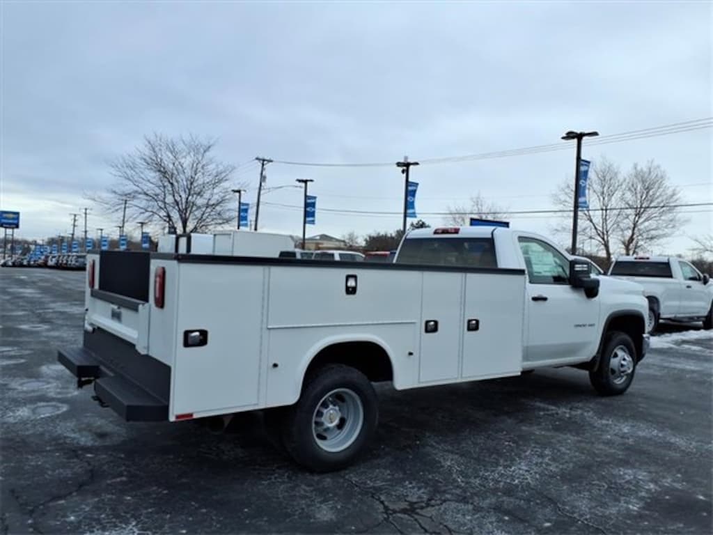 2026 Chevrolet 3500 regular cab chassis, 6.6L Duramax turbo diesel, 4wd, dual rear wheel, 14,000 LB GVWR. 11' Knapheide 6132D54 Service Body with KnapLined Galva-Grip bumper and full over the cabinet spray in liner. Knapheide Electronic Locking System wired into OEM power door locks. Trailering equipment, front and rear stobe system.