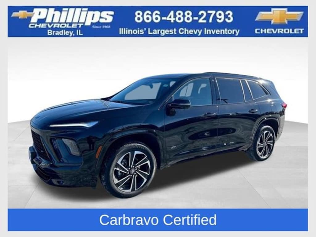 Carbravo Certified, One Owner, Apple CarPlay, Android Auto, Keyless Entry, Adaptive Cruise Control (ACC), Back Up Camera, Blind Spot Monitoring, Bluetooth, BOSE Audio, Heated seats, Heated steering wheel, Forward Collision Alert, Lane Assist, Pedestrian Monitoring, Power Locks, Power Seating, Power Windows, Push Button Start, Rear Traffic Alert, Remote start, Rear Park Assist, Carfax Buyback Guarantee, Enclave Sport Touring, 4D Sport Utility, 2.5L DOHC, 8-Speed Automatic, FWD, Ebony Twilight Metallic, Ebony w/Sky Cool Gray & Ebony Accents w/Leatherette Seat Trim, 3rd row seats: split-bench, 4-Wheel Disc Brakes, ABS brakes, AM/FM radio: SiriusXM with 360L, Auto High-beam Headlights, Auto-dimming door mirrors, Auto-dimming Rear-View mirror, Automatic temperature control, Bose Premium 12-Speaker Audio System, Brake assist, Bumpers: body-color, Compass, Deleted OnStar Basics, Driver 4-Way Power Lumbar Seat Adjuster, Driver 8-Way Power Seat Adjuster, Driver door bin, Driver vanity mirror, Dual front impact airbags, Dual front side impact airbags, Electronic Stability Control, Emergency communication system: OnStar and Buick connected services capable, Four wheel independent suspension, Front anti-roll bar, Front Bucket Seats, Front Center Armrest, Front dual zone A/C, Front Passenger 4-Way Power Lumbar Seat Adjuster, Front Passenger 6-Way Power Seat Adjuster, Front reading lights, Fully automatic headlights, Heated door mirrors, Heated steering wheel, Illuminated entry, Leather steering wheel, Low tire pressure warning, Navigation System, Occupant sensing airbag, Outside temperature display, Overhead airbag, Overhead console, Passenger vanity mirror, Perforated Leatherette Seat Trim, Power door mirrors, Power driver seat, Power Liftgate, Preferred Equipment Group 1SM, Premium audio system: Buick Infotainment System, Radio data system, Radio: Infotainment Center, Rear air conditioning, Rear anti-roll bar, Rear reading lights, Rear side impact airbag, Rear window defroster, Remote keyless entry, Security system, SiriusXM with 360L Trial Subscription, Speed control, Speed-sensing steering, Spoiler, Sport steering wheel, Steering wheel mounted audio controls, Tachometer, Telescoping steering wheel, Tilt steering wheel, Traction control, Trip computer, Turn signal indicator mirrors, Voltmeter, Wheels: 20 Alloy with High Gloss Black, Wireless Apple CarPlay, Wireless Google Android Auto. CARFAX One-Owner. Clean CARFAX. Certified. Ebony Twilight Metallic 2025 Buick Enclave Sport Touring FWD 8-Speed Automatic 2.5L DOHCRecent Arrival! 20/27 City/Highway MPGCertification Program Details: Type your description hereWith the internet today, a great value shouldn't be hard to find. Here at Phillips Chevrolet we do the research for you. We monitor the market daily to ensure our customers are getting the best value achievable. We price all of our vehicles to make the buying process as simple and easy as possible. Our internet prices are just one factor that makes us the #1, #2, and out to be the #3 Chevrolet dealerships in Illinois. The future #3 Chevy dealership in Illinois is conveniently located at 1400 Locke Drive, the corner of I-57 & IL 50, in Bradley/Bourbonnais, IL 60914.