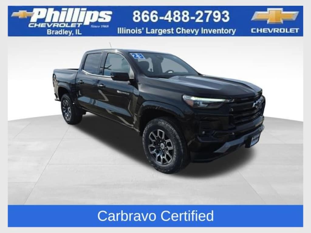 Carbravo Certified, One Owner, Apple CarPlay, Android Auto, Keyless Entry, 4WD, Back Up Camera, Bluetooth, Cruise Control, Forward Collision Alert, Lane Assist, Pedestrian Monitoring, Power Locks, Power Seating, Power Windows, Push Button Start, Remote start, Carfax Buyback Guarantee, Colorado Z71, 4D Crew Cab, 2.7L Turbo, 8-Speed Automatic, 4WD, Black, Jet Black w/Evotex Seat Trim, 220 Amp Generator, 3.42 Rear Axle Ratio, 4-Wheel Disc Brakes, 6-Speaker Audio System Feature, ABS brakes, Advanced Trailering Package, Air Conditioning, AM/FM radio: SiriusXM, Apple CarPlay/Android Auto, Auto High-beam Headlights, Black Spray-On Bedliner w/Chevrolet Logo, Brake assist, Bumpers: body-color, Chevy Safety Assist, Compass, Electronic Automatic Cruise Control, Electronic Stability Control, Front fog lights, Heated door mirrors, Heavy-Duty Trailering Package, IntelliBeam Automatic High Beam On/Off, Lane Keep Assist w/Lane Departure Warning, Navigation System, Outside temperature display, Power door mirrors, Preferred Equipment Group 4Z7, Radio data system, Radio: 11.3 Diagonal Advanced Color LCD Display, Rear step bumper, Rear window defroster, Rear-Window Electric Defogger, Remote keyless entry, Security system, SiriusXM Radio, Speed-sensing steering, Steering Wheel Mounted Audio Controls, Steering wheel mounted audio controls, Traction control, Trailering App, Variably intermittent wipers, Wheels: 18 x 8.5 Android Dark Full Gloss Aluminum, Wireless Phone Projection. CARFAX One-Owner. Certified. Black 2023 Chevrolet Colorado Z71 4WD 8-Speed Automatic 2.7L TurboRecent Arrival! Odometer is 14326 miles below market average!Certification Program Details: Type your description hereWith the internet today, a great value shouldn't be hard to find. Here at Phillips Chevrolet we do the research for you. We monitor the market daily to ensure our customers are getting the best value achievable. We price all of our vehicles to make the buying process as simple and easy as possible. Our internet prices are just one factor that makes us the #1, #2, and out to be the #3 Chevrolet dealerships in Illinois. The future #3 Chevy dealership in Illinois is conveniently located at 1400 Locke Drive, the corner of I-57 & IL 50, in Bradley/Bourbonnais, IL 60914.